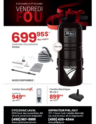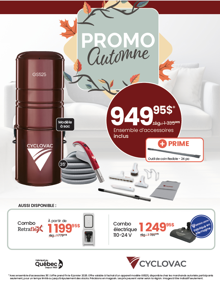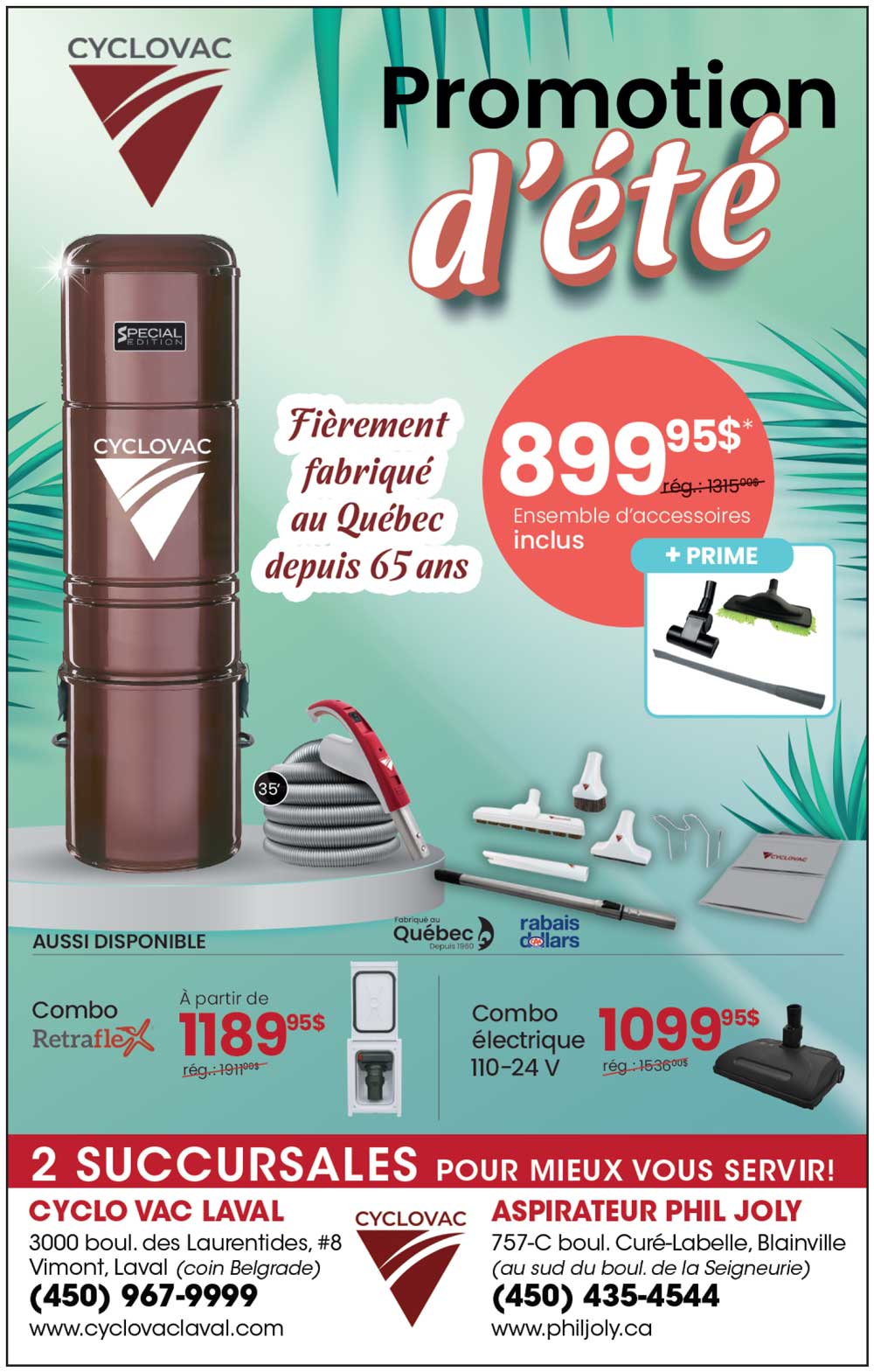 PROMOTIONS Passez à niveau supérieur avec nos offres àprix réduit VOIR TOUTES LES PROMOTIONSRECEVEZ LES PROMOTIONS PAR COURRIEL PROMOTIONS EN COURS Profitez de nos offres exceptionnelles Cyclo Vac pour passer à un niveau supérieur!